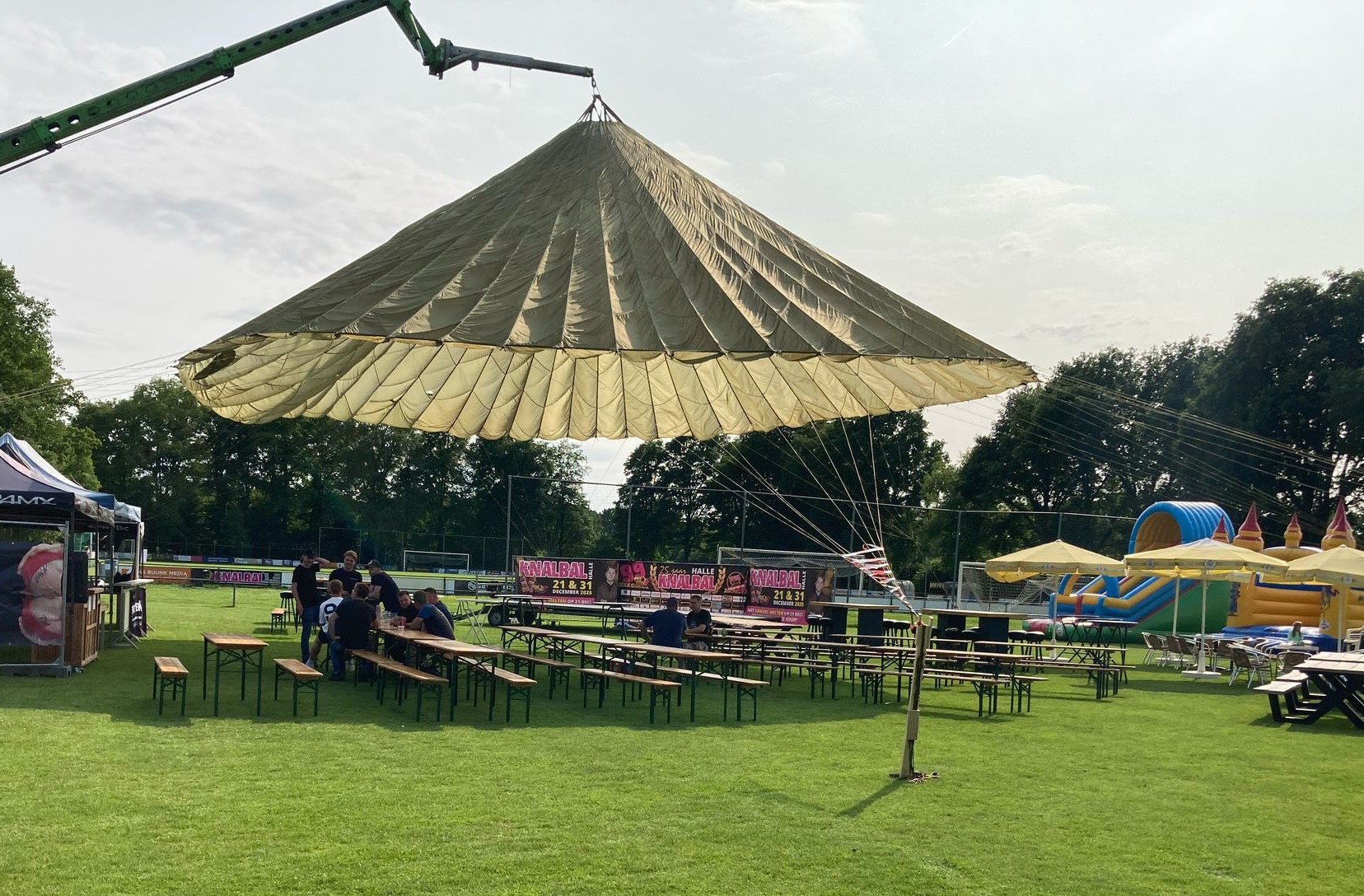Onze parachutes, met een doorsnede van ongeveer 16 meter dienen aan een (telescoop)kraan te worden opgehangen en rondom op een achttal punten te worden afgespannen.